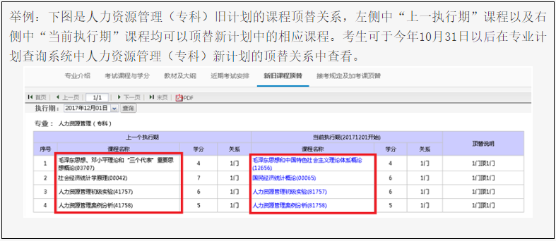 考生已经合格的课程,如没有出现在此次公布的新计划中新旧课程顶替关系里,一般存在三种情况:一是考生通过的课程在新计划中仍然使用,无需顶替。如中国近现代史纲要(03708)、马克思主义基本原理概论(03709)等,新旧计划中课程名称和代码完全相同,所以视为一门课,不用设置顶替关系;二是考生的课程属于上一执行期的课程,即为上图左侧的课程,此次在文件中不出现,我们会在管理系统内设置,考生可通过网站专业计划查询具体查看;三是考生通过的课程是更早执行期的课程,此次调整前已经无法顶替现执行期的课程。
