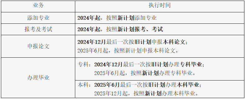 (2)论文和毕业申报。为保障广大考生利益,我们设置了论文和毕业申报新旧计划衔接过渡,2024年为新旧计划衔接过渡期。过渡期内,考生仍可按照旧计划申报毕业和本科论文。其中,2024年12月,本科论文以及专科毕业最后一次按照旧计划申办。2025年6月,本科毕业办理最后一次按照旧计划申办。