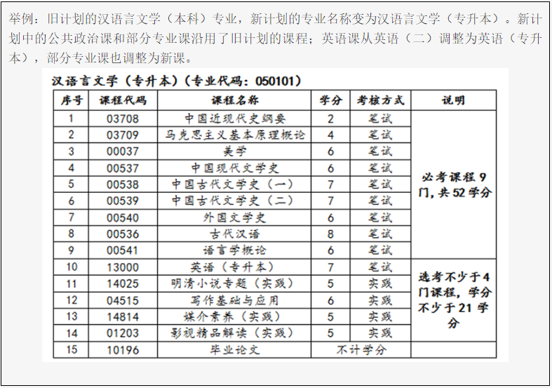 (1)考试安排。自2024年上半年开始,将按照新计划课程安排考试,2023年10月将是旧计划课程最后一次考试。需要考旧课程的考生,应抓住2023年10月最后一次旧课程考试机会。需要注意的是,新计划仍然沿用了部分旧计划课程,如:中国近代史纲要等课程,这些课程在新计划中继续开考。