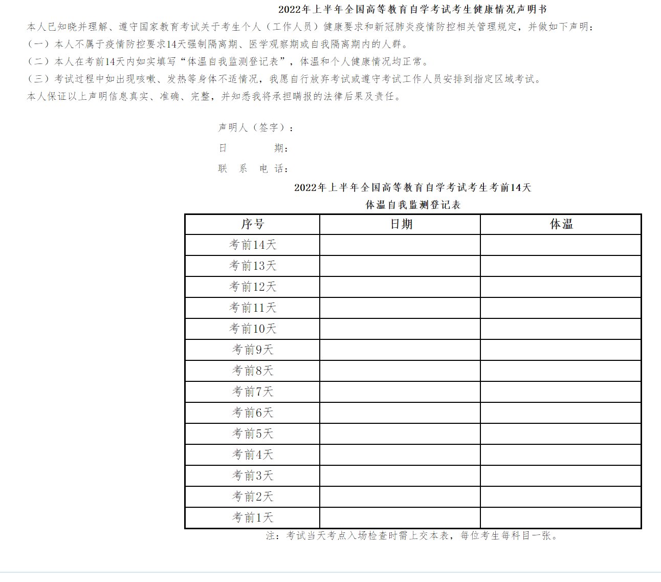 2022年上半年全国高等教育自学考试考生健康情况声明书