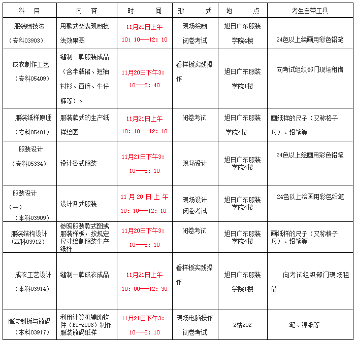 根据省自考办的文件精神,惠州学院定于2021年11月组织一次自考《服装设计与工程》和《服装与服饰设计》专业的实践考核。具体安排如下: