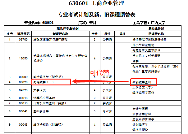 以广西自考专科工商企业管理为例,在原专业计划中通过的“经济数学基础”可以顶替“高等数学(一)”课程。