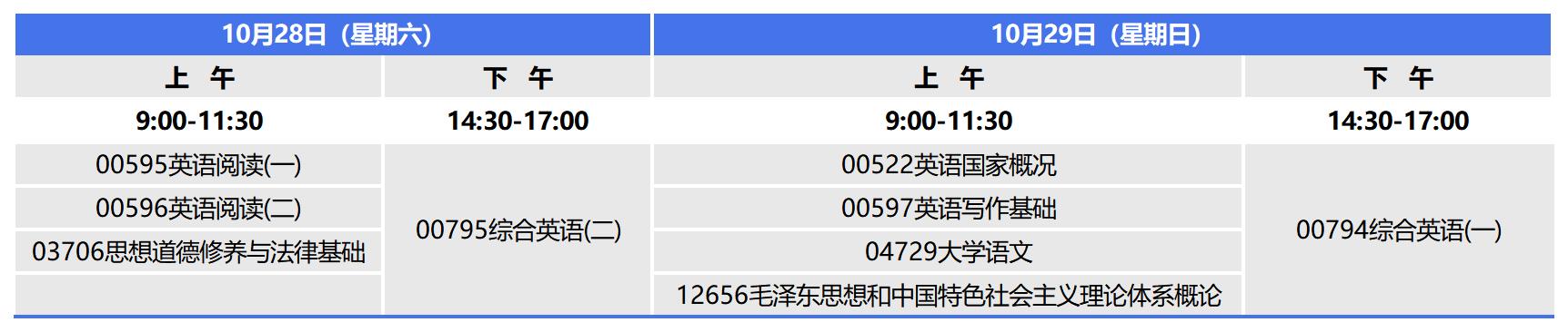 河南自考专科英语专业,专业代码970202(原专业代码:050207),2023年10月自考考试时间为10月28日-29日,上午9:00-11:30,下午14:30-17:00,本次考期共开考9门课程,具体科目安排如下: