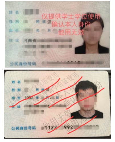 也可以直接在身份证上做水印,用图片处理工具给身份证正反面加好标注再上传。如下示例(你制作的证件不要打码!!!):