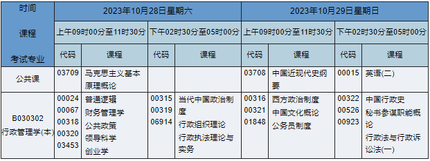2023年10月湖南自考本科行政管理学专业(专业代码:B030302)课程安排如下: