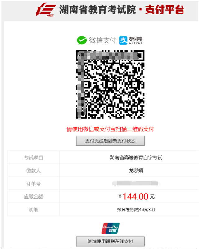 第六步:通过湖南省教育考试院支付平台完成网上支付