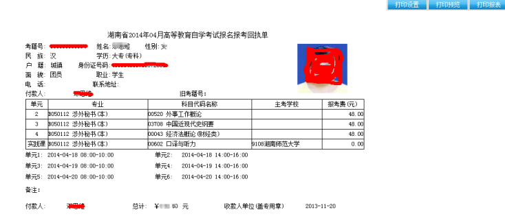 考生在报考缴费成功后,请务必打印报考回执单,在课程报考主界面点击“打印回执单”按钮,进入打印回执单界面: