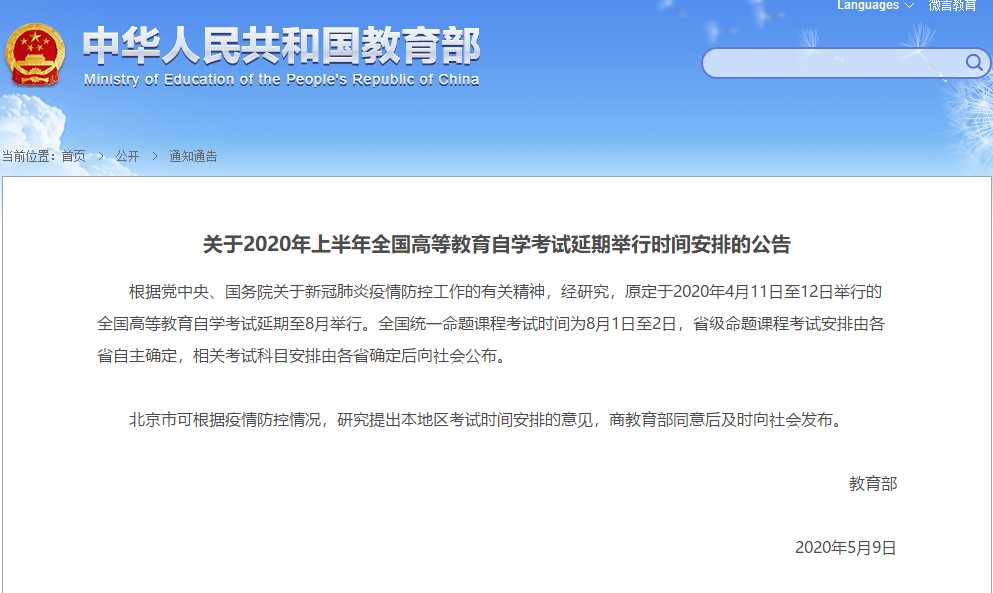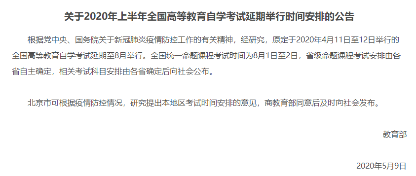 教育部发布通知,2020年第一次高等教育自学考试时间正式确定,时间为:2020年8月1日、8月2日两天!