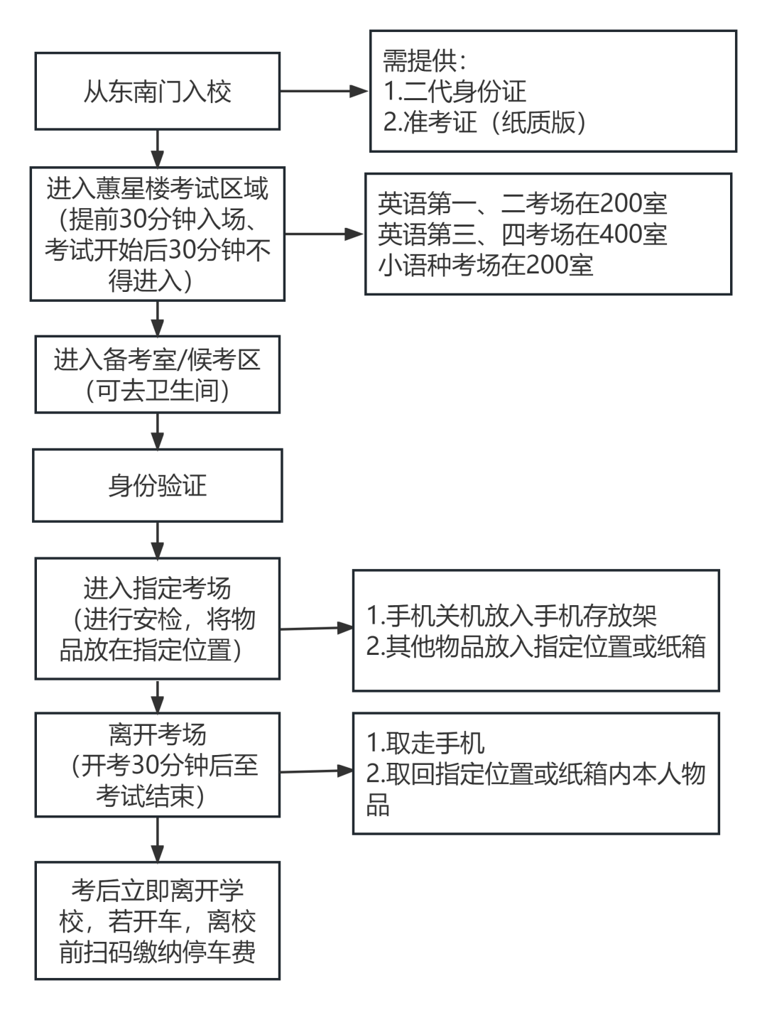 四、考生需从东南门入校,出示二代身份证、准考证(必须为纸质版)。开车入校,限速20km/h,禁止鸣笛,停车费5元/小时,离校前可扫描二维码支付,机动车只能从东南门进出。