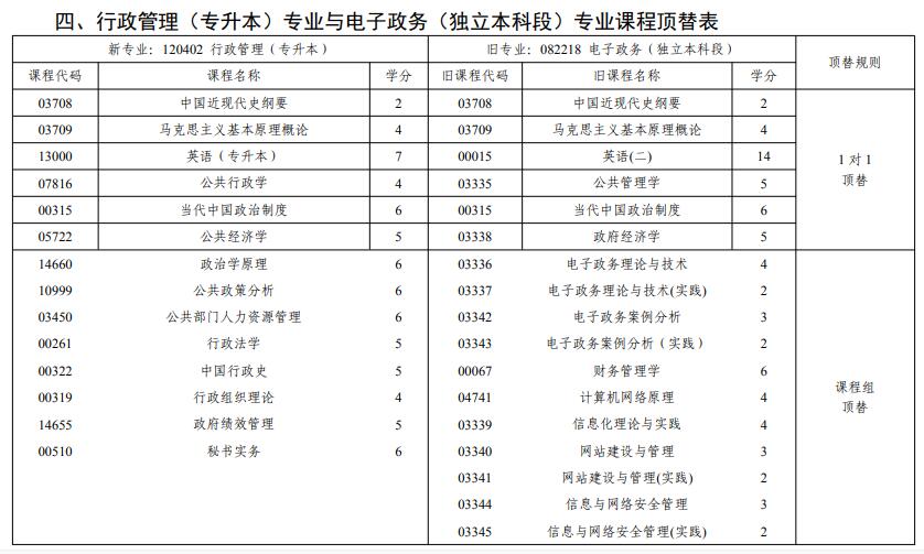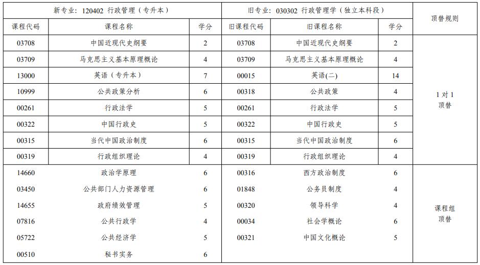 行政管理(专升本)专业与行政管理学(独立本科段)专业课程顶替表