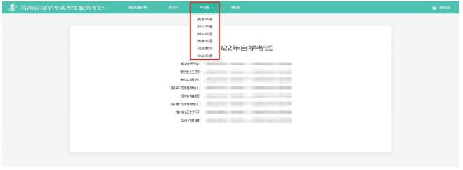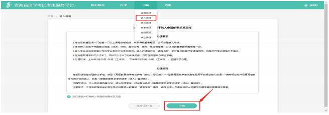 (1)进入青海省自学考试考生服务平台(点击咨询网站入口>>),找到页面上方“申请”并在弹出的菜单中选择“转入申请”;