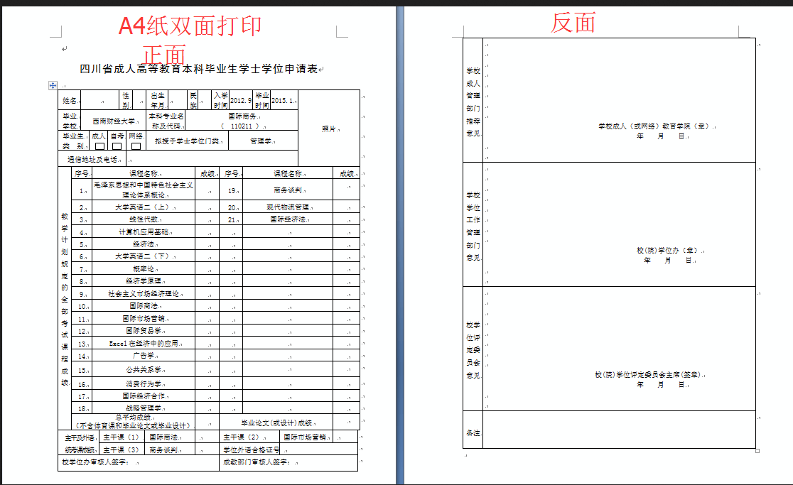 (二)完成网上信息申报后,学院将在2个工作日内进行初审,学生须及时关注,审核未通过的须按页面提示信息在申请时限内修改后再次提交,直至审核通过。审核通过的学生方可打印《基本信息登记表》和《四川省成人高等教育本科毕业生学士学位申请表》(后面简称学位申请表)。《学位申请表》为正反两面,须按打印设置要求使用A4纸双面打印如图: