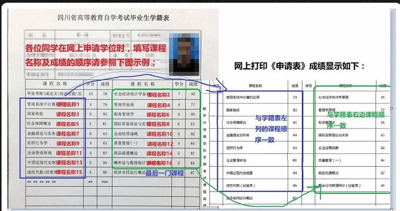 (三)自考毕业生网上申请时,需要在“其它信息填写”中自行填报课程名称及成绩,为保证最后网上打印的《学位申请表》中课程顺序符合要求,请务必按下图所示顺序填报: