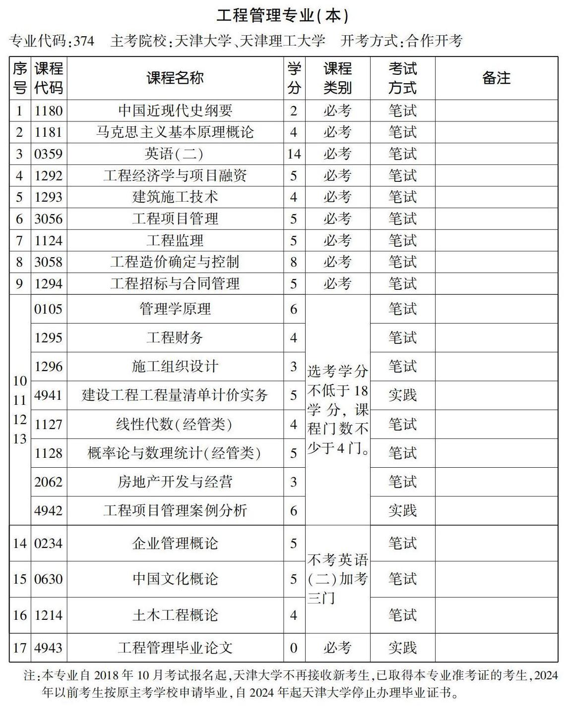 2022年10月天津自考本科工程管理专业计划