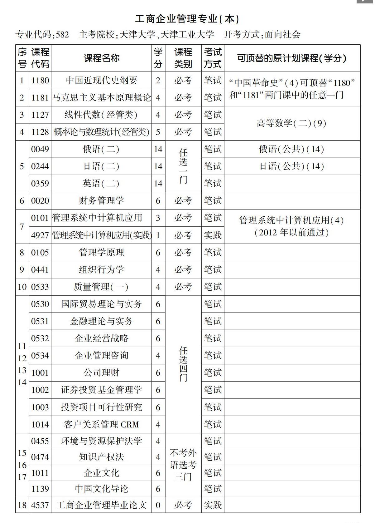 2023年10月天津自考本科工商企业管理专业计划