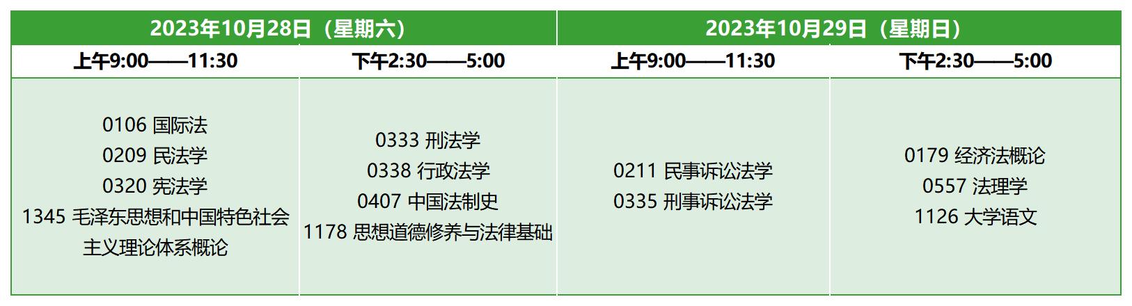 天津自考专科法律事务专业(原专业名称:法律),专业代码580401(原专业代码:515),2023年10月自考考试时间为10月28日-29日,上午9:00-11:30,下午14:30-17:00,该专业本次考期共开考13门课程,具体课程考试时间安排如下: