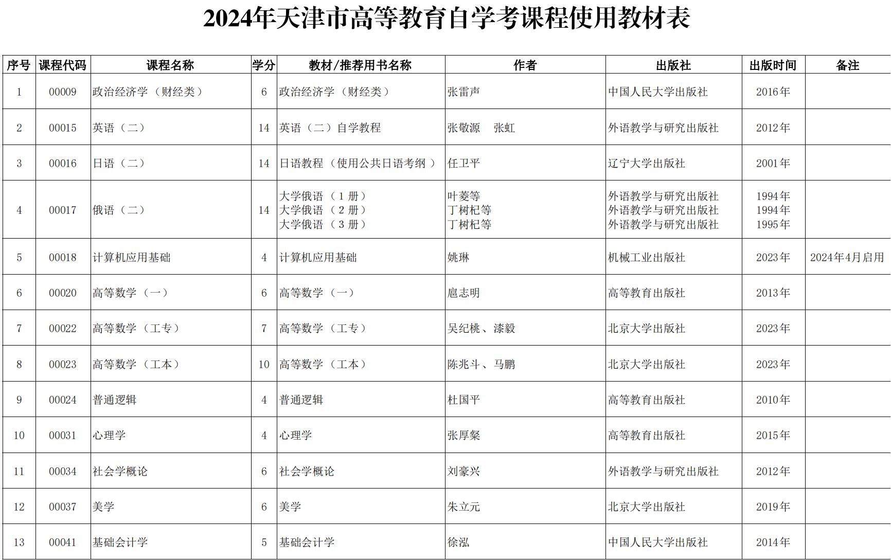 2024年天津市高等教育自学考课程使用教材表发布(点击下载),详情如下: