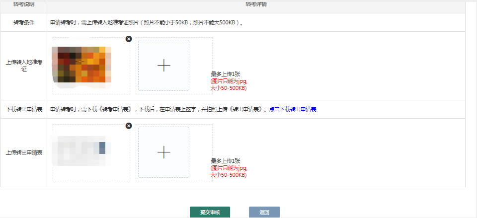 第六步:转出材料上传完毕之后,点击“提交审核”即可,转考申请操作完毕。请随时关注转考状态,并保持手机畅通。