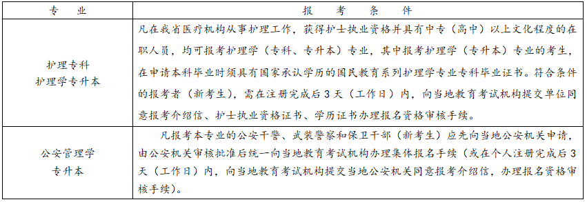 下表所列专业对报考条件、报考程序有特殊限制,考生报考须符合下表具体规定;考生个人或社会助学单位违反报考条件限制规定报考,分别由考生本人或办理集体报名的助学单位承担责任,并将受到不承认考试结果、不受理毕业申请的处理。